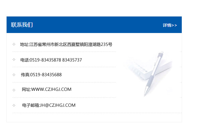 地址:常州市新北區友邦商務大廈1幢16、17層  電話:0519-85101652  傳真:0519-85112595  郵編:213022  網址:www.cz-jiayue_cn.szcasmrc.com  郵箱:xiajifengaa@163.com